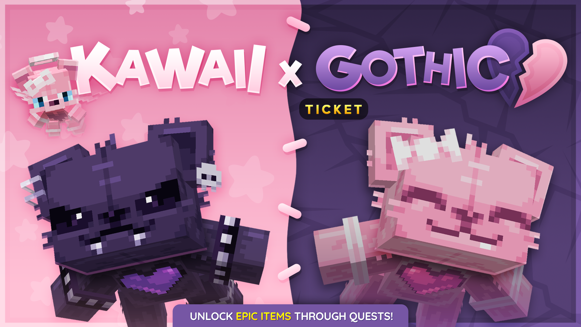 Purchase this ticket (1870 Minecoins) to instantly unlock awesome kawaii and gothic cosmetics, and take on exclusive quests to unlock bonus rewards, including additional in-game cosmetics, as well as special variants for the included mount, pet and hat.